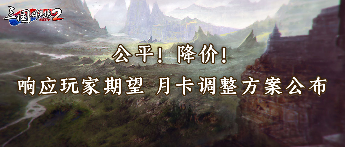 《三国群英传2》网络版月卡服凭借其公平、纯粹的原则,受到了广大主公的热切关注。在月卡类型与定价投票公布以后,主公们提出了较多关于付费、游戏体验方面的中肯建议,表达了自己对这款游戏所投入的深厚感情,同时也期望适当调整收费标准。我们在收集了建议、听取玩家心声及认真讨论后,现已根据各位主公的反馈进行了相应调整。