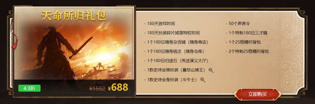 喜迎月卡服公测,超值礼包将同步上线!英雄崛起礼包(包含180天月卡时间)原价944元,仅售498元;天命所归礼包(包含180天高级月卡时间)原价1582元,仅售688元。限时优惠,购买即享超值福利!
