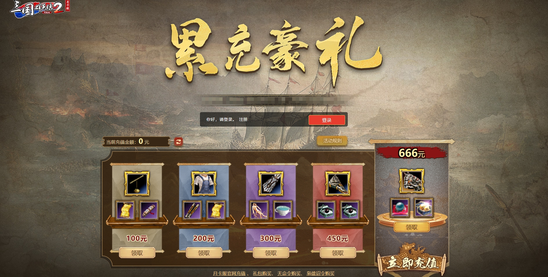 1、活动期间内,凡在月卡服的任意充值(包含月卡、高级月卡、元宝、天命令、英雄崛起礼包、天命所归礼包、枭雄诏令的购买)均会被计入累充金额。