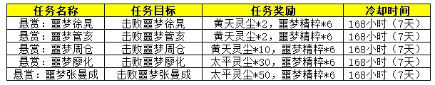 · 玩家可在副本内的NPC「校尉 董吴」处,接取以下周常任务(该任务完成后的168小时内都无法再次接取,可在特别状态栏查看到期时间)