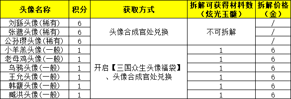 3、演义大厅中的「头像合成官」处,移除原有兑换条目,并新增以下兑换条目: