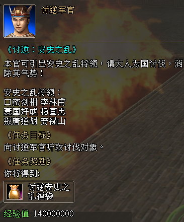 3、增加全新的每日讨逆任务《讨逆:安史之乱》,该任务承接等级为331级至340级