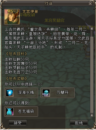 2. 每次完成【龙抬头】任务,可从“深海水精*3”与“万孽丹*3”中任意选取一种奖励,并获得固定奖励“苍龙福袋*1”。打开“苍龙福袋”,有概率获取如下道具(每次仅获得一种道具):
