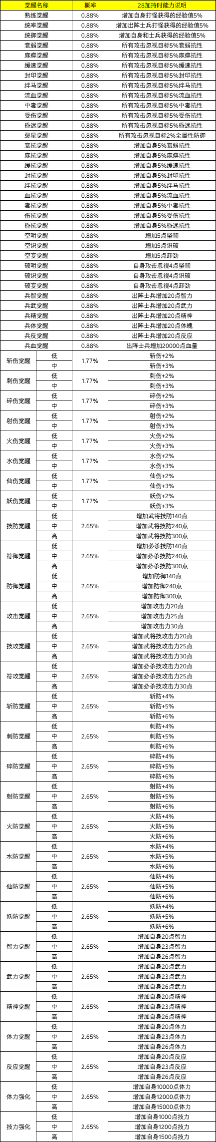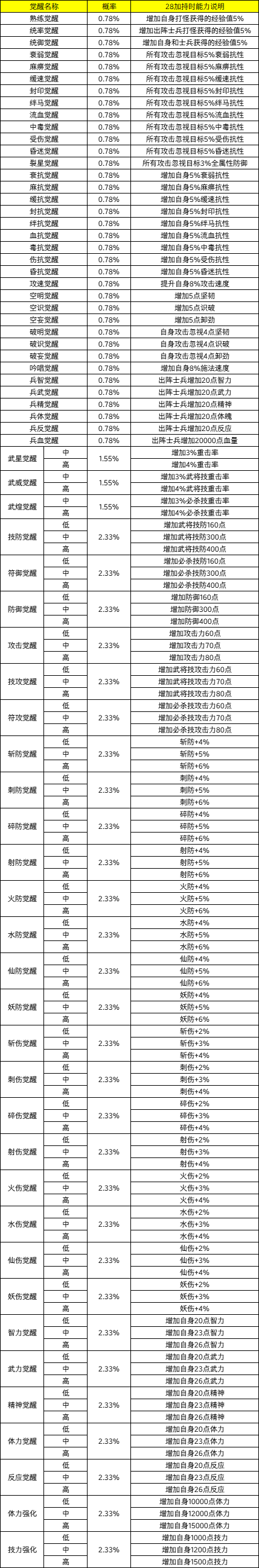 ·以下为士兵防具觉醒的能力列表