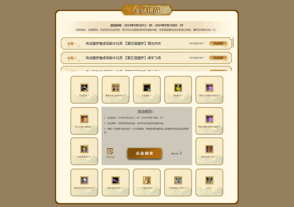 在参与上述活动的同时,也别忘了参与网页活动中的免费抽奖!挑战噩梦副本、完成对应任务,即可免费获得金风挑战的抽奖次数,有机会赢得【霸绝龙将】、【玄武】、【幽影】等超高价值道具!快来趁此良机试一试手气吧!