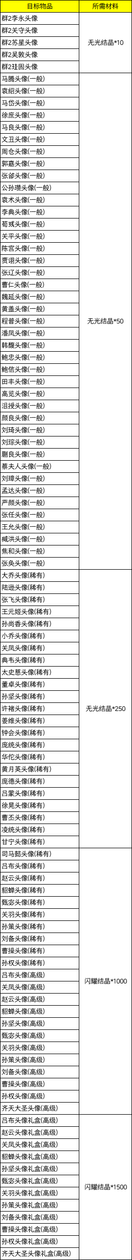 其他头像为:马腾、袁绍、马岱、徐庶、马良、文丑、周仓、郭嘉、张郃、公孙瓒、袁术、李典、荀彧、关平、陈宫、贾诩、张辽、曹仁、魏延、黄盖、程普、田丰、高览、沮授、孙权、刘琦、刘琮、蒯良、蔡夫人、刘璋、孟达、严颜、张任、王允、臧洪、焦和、张奂、金角郡主、银角郡主、蜘蛛精、铁扇公主