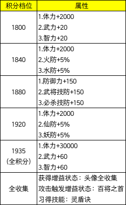 3)增益状态:百将之首效果增强为【体力+10000、武将技防御力+1500、必杀技防御力+1500、出阵士兵全攻击力+100、出阵士兵全属伤+2%、出阵士兵全属防+20%、出阵士兵抵伤率+20%、攻击时有50%几率获得增益状态:百将之首】